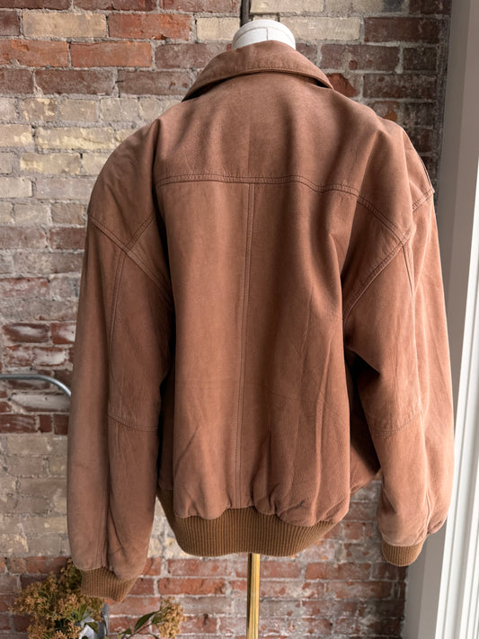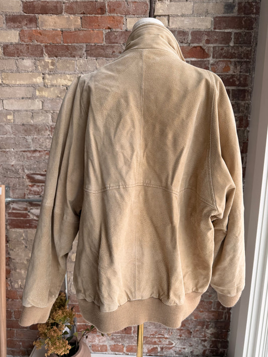 90s LLBean khaki bomber with leather collar. Made in Hong Kong.