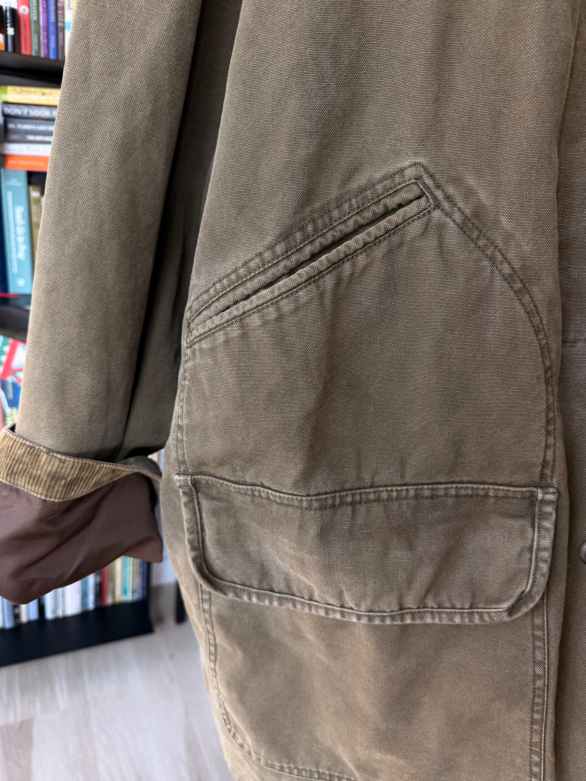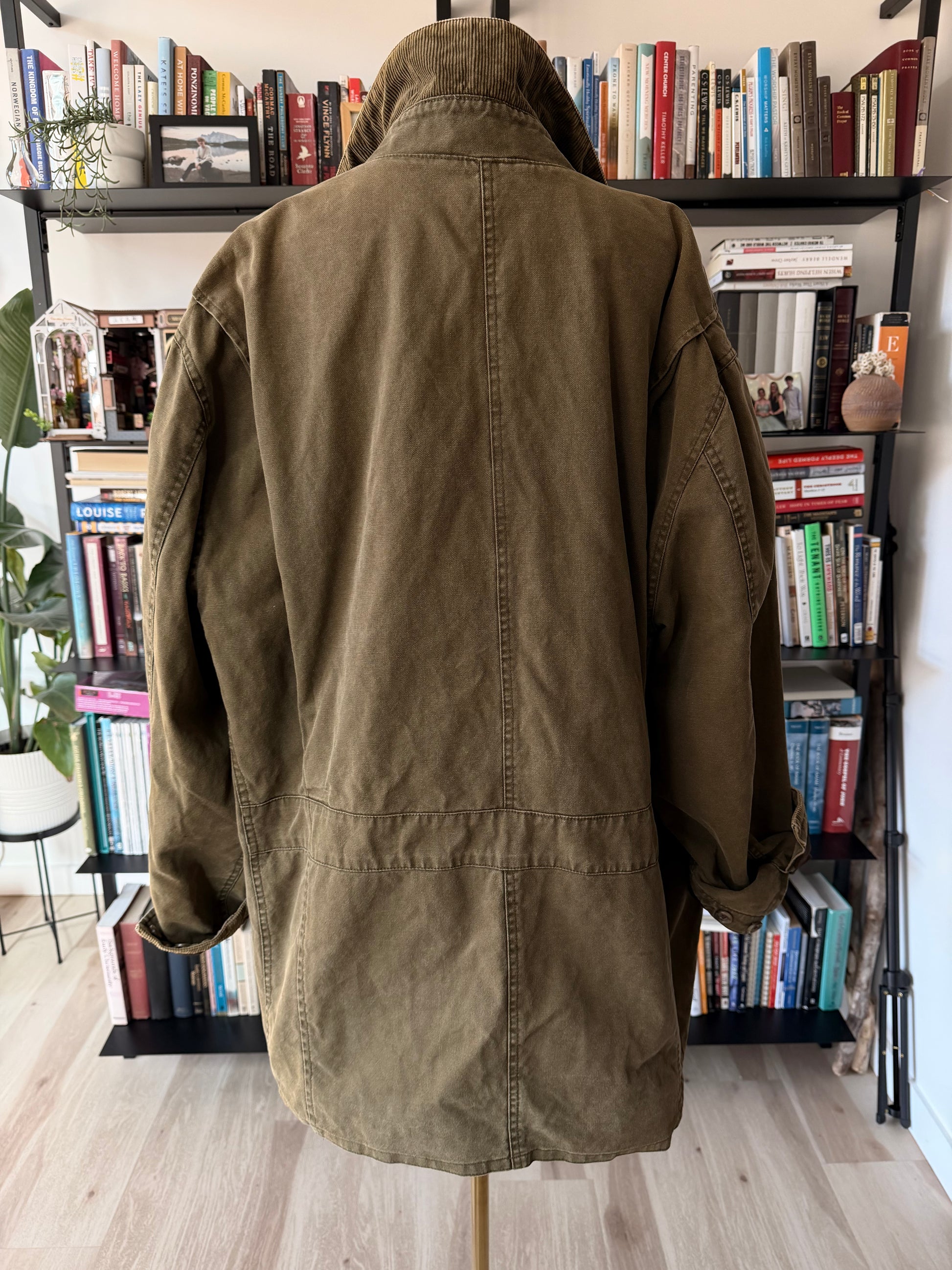 90s Banana Republic green barn coat. Made in Hong Kong. Leather collar (some wear) and corduroy details. Excellent vintage condition