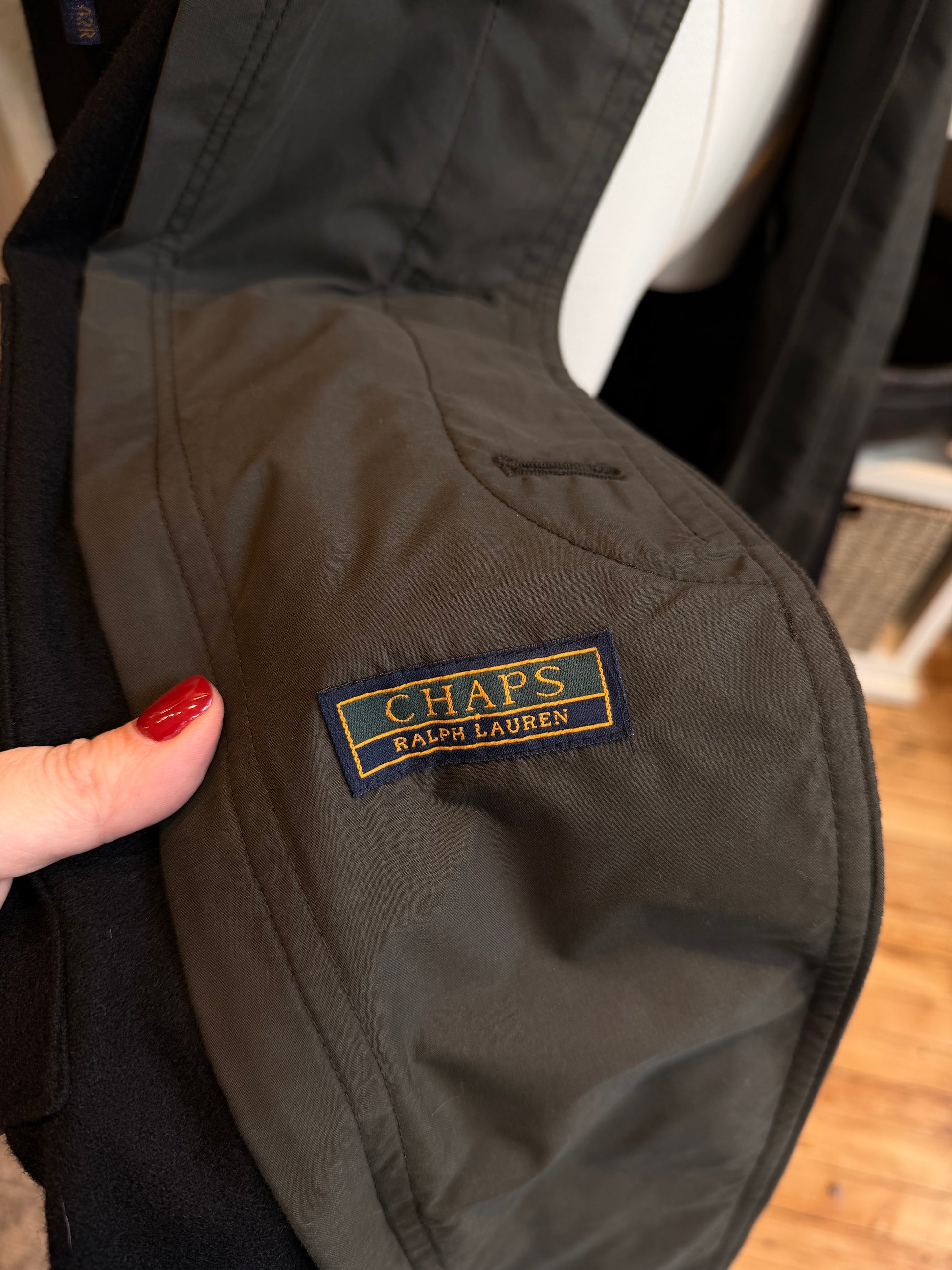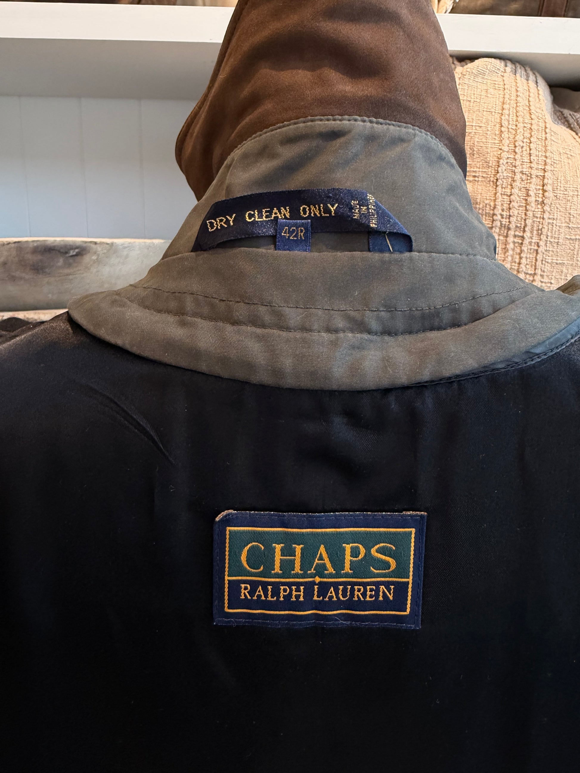 90s Chaps Ralph Lauren green trench with leather collar and removable wool lining. Excellent condition